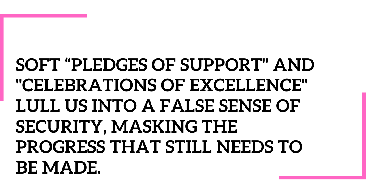 Instead, soft “pledges of support” and “celebrations of excellence” lull us into a false sense of security, masking the progress that still needs to be made.